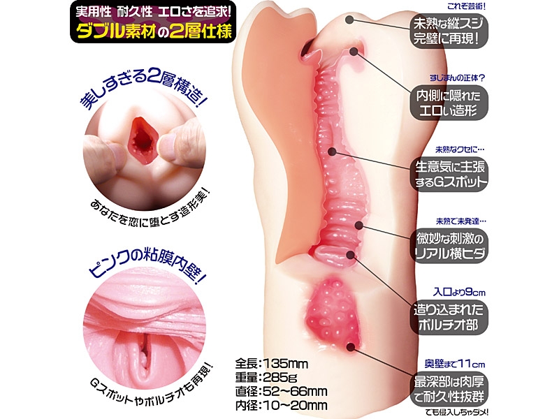 パッケージが清楚でかわいらしく、箱にわざと開けられた穴からポストカードを覗かせてかなり凝っています。本体の外観はスジマンがとてもかわいいです。実際に手にとって見ると肌触りがとても軟らかくて気持ちよく、ロリのイメージを膨らませてくれます。エア抜きするとスジマンは完全に閉じ、見た目はまるでロリマンです。陰唇を開いて入口から中まで実に卑猥でリアルです。視覚的に優れたオナホールと言えるでしょう。