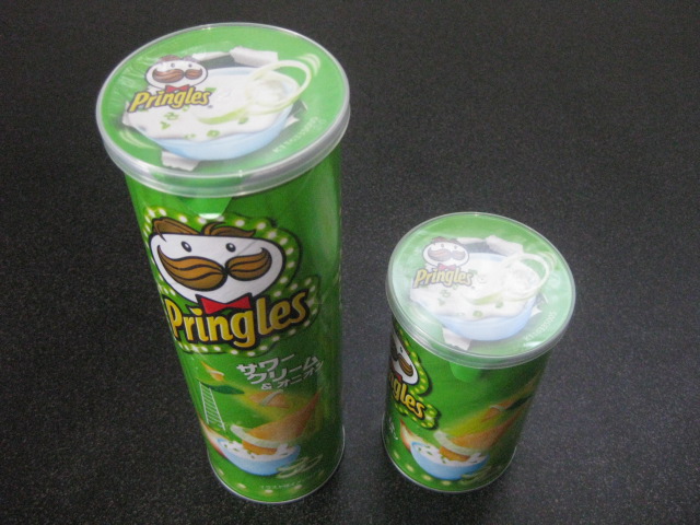 Lサイズ・Sサイズともに、3社中で最も容量が小さいです。ちなみに円筒の直径はどのメーカーも同一規格です。材質は底部がアルミ製なので強度があります。中身のポテトチップスが箱の中にそのまま入っています。つまり内側にアルミが張られて油対策が施されています。この点はオナホ向きですね。外側にかぶせるフタはビニール樹脂製。密封用の内側のフタは防油加工された樹脂製。他の部分の材質は紙製です。内側のフタがはがれると扱い難くなる半面、外側のフタを閉めると中身がわかられることはなさそうな構造です。